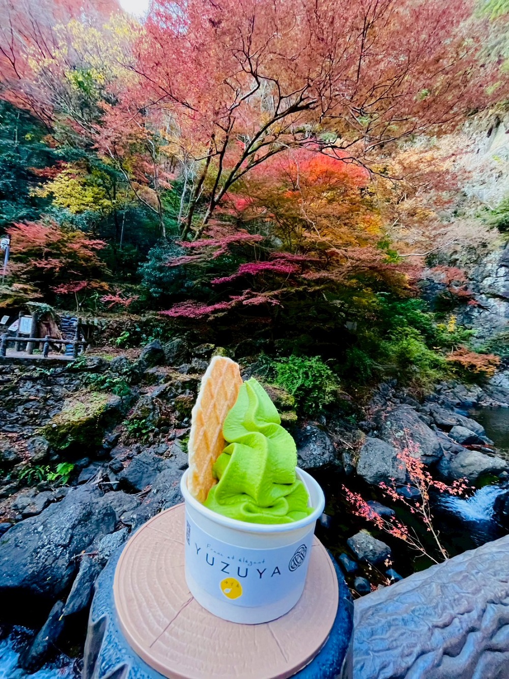 現地の売店で抹茶アイスを食べましたが、抹茶の緑と紅葉のコントラストも美しい☆