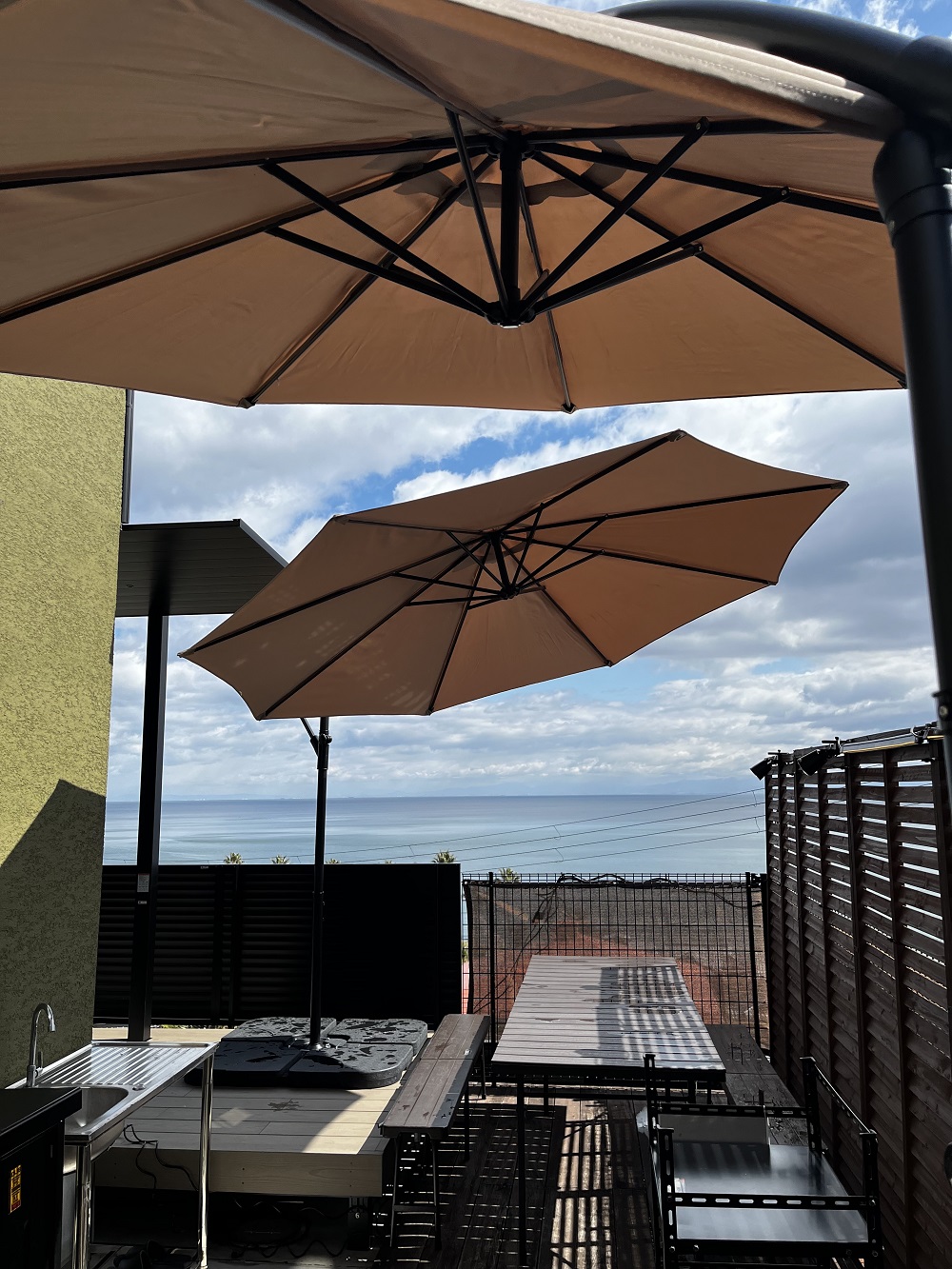 今までアウトドアテーブルとベンチを海側のウッドデッキスペースに設置していたのですが、南側のウッドデッキスペースに移し、目隠しを立てて、ハンギングパラソルを設置しました☆